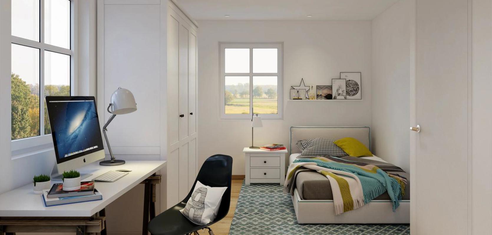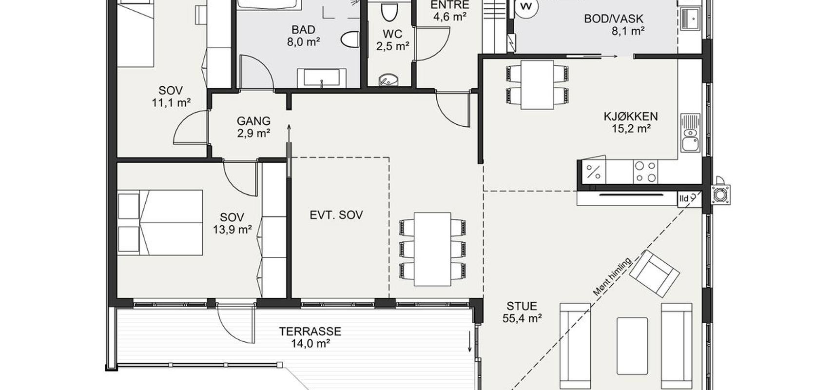 Holmen er en praktisk enebolig hvor alt er på ett plan. Boligen har en smart planløsning som deler huset inn i to soner. Når du kommer inn i entreen er det et gjestetoalett, som også er svært praktisk med små barn. Når du kommer videre inn finner du en privat sone med bad og to soverom til høyre, og det er mulig å bruke en del av oppholdsrommet til et tredje soverom. Det største soverommet har også direkte utgang til terrassen.