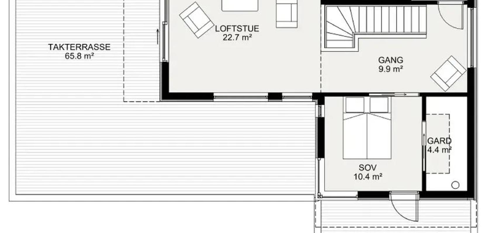 Toppetasjen har to takterrasser. En privat, med adkomst fra et større soverom. Dette drømmesoverommet har både privat uteplass og en romslig gå-inn-garderobe. I tillegg er det en stor terrasse på hele 65 kvadratmeter, med utgang fra loftstuen. Felles for begge terrasser er at taket stikker en god del ut over fasaden slik at man har mulighet å sette ting som puter og gjenstander under hvis regnet kommer. Etasjen inneholder også et bad.