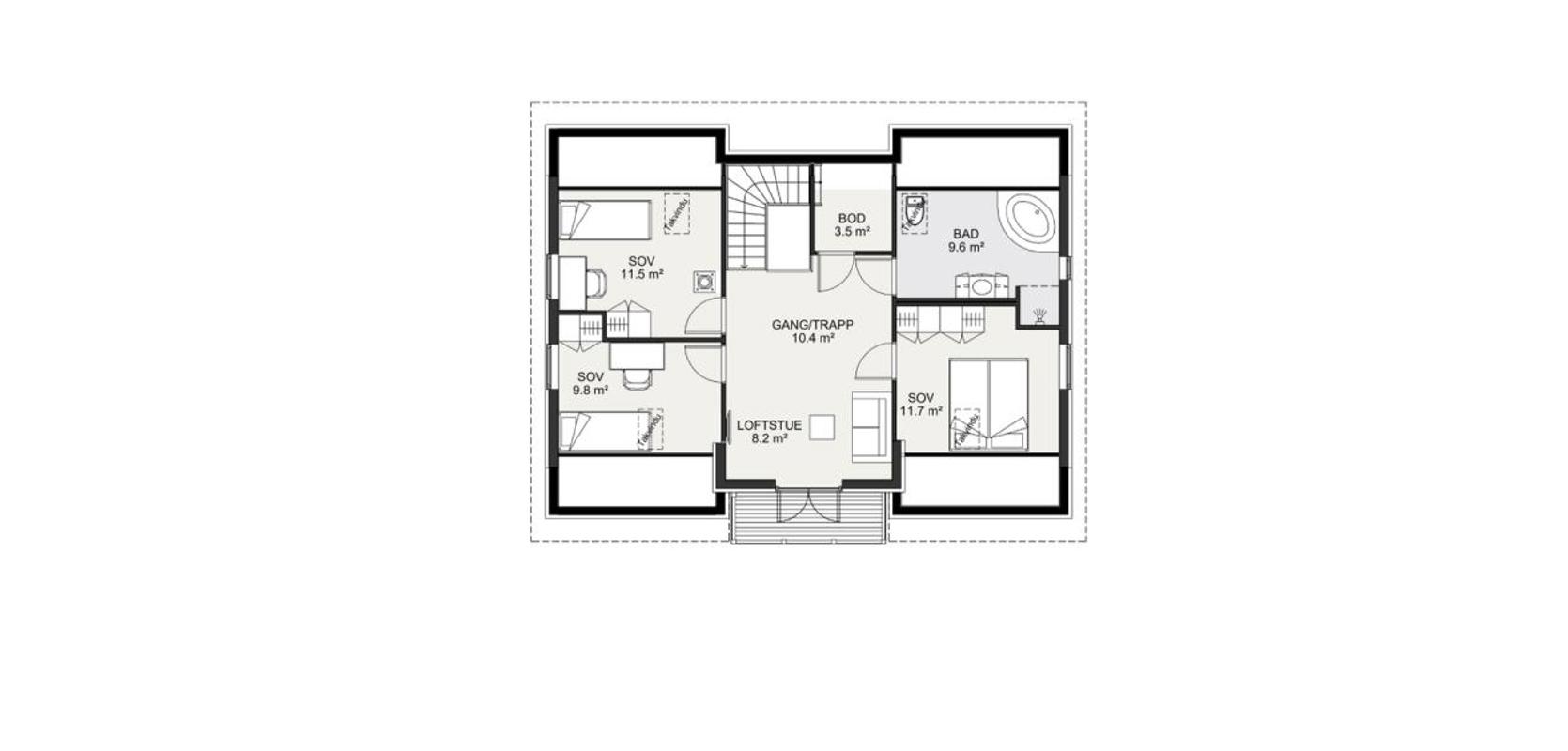 I andre etasje finner du tre soverom, et stort og flott bad, samt en romslig bod. Denne etasjen har også en egen loftstue som kan fungere som en TV-stue og oppholdsrom. Loftstuen er også et flott sted for barna å ha venner på besøk. Dersom du ikke har behov for så mye plass i starten, kan du velge å vente med å innrede andre etasje.