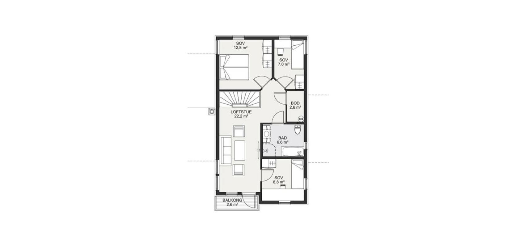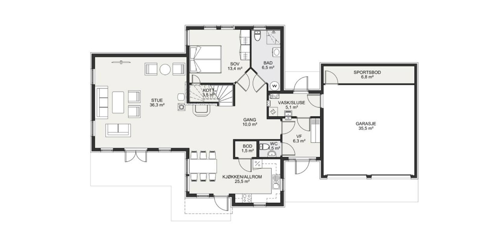 Med fire soverom og store oppholdsrom kan Mesterhus Norunn tilpasses enhver livsfase. Bad finnes i begge etasjer, og gir ekstra komfort og bekvemmelighet.