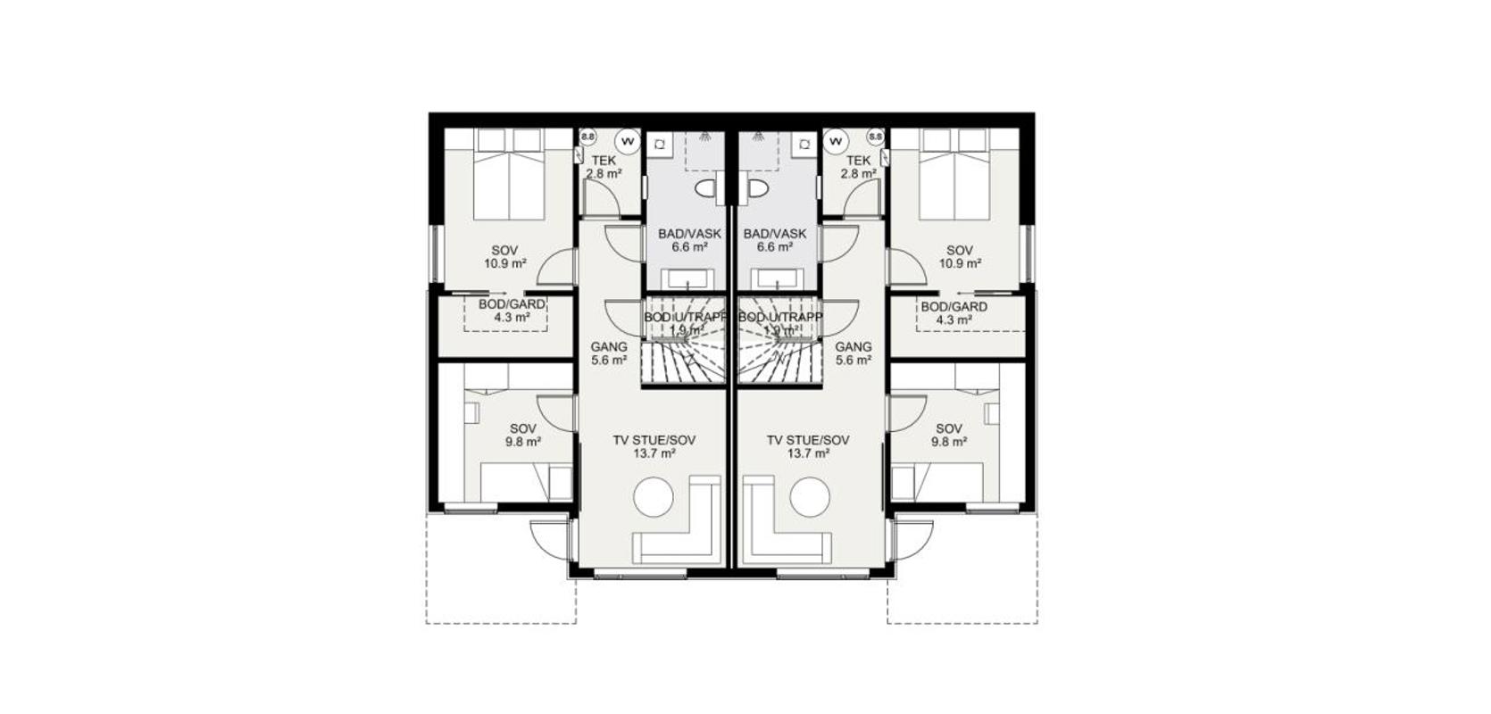 Begge boenhetene er speilvendte og har skjermede balkonger på hver side. I tillegg har hver enhet sitt eget herlige, private uteområde på bakkeplan. En annen fordel er at huset er spesialtilpasset for en skrå tomt, slik at du kan få inngang i begge etasjene.
