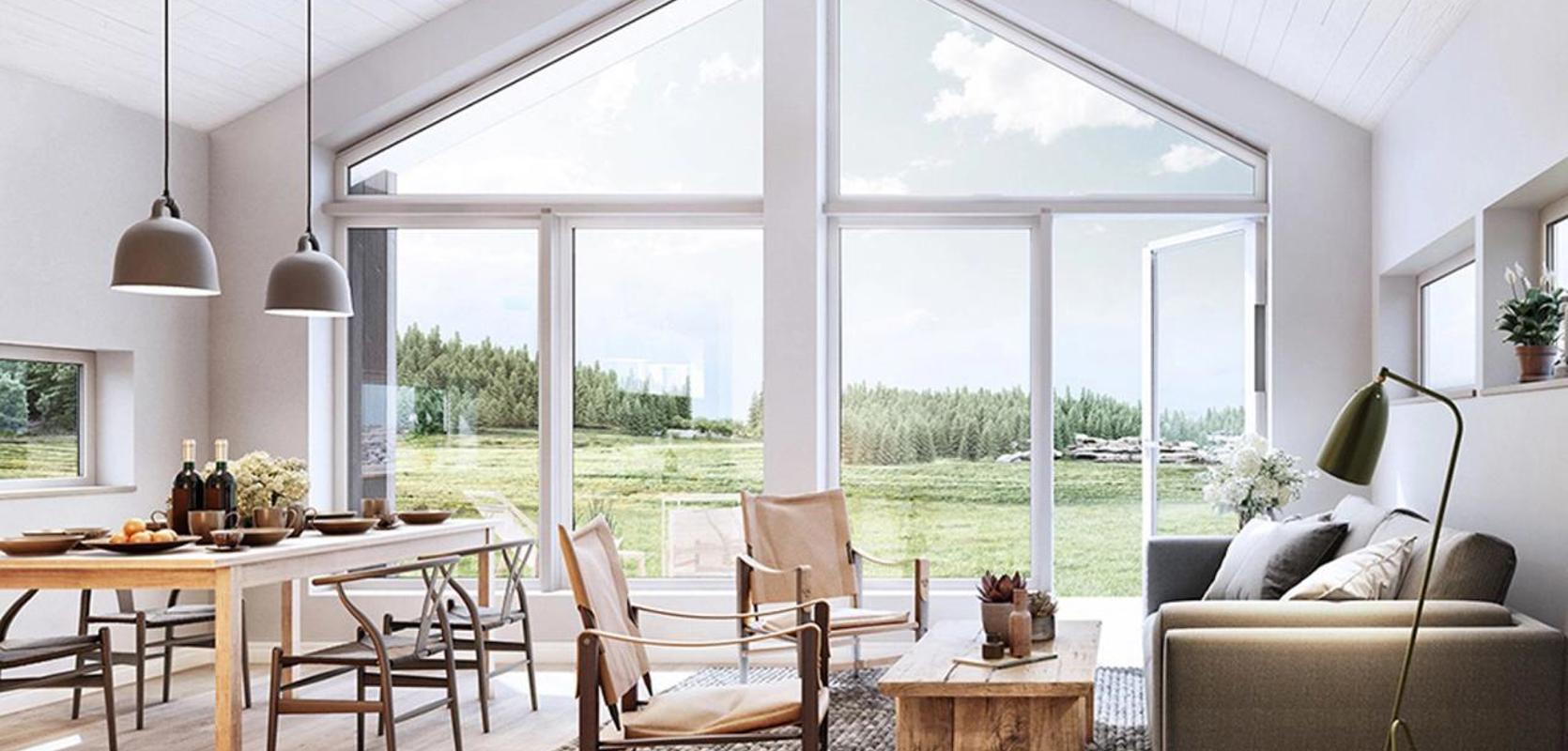 Spiseplass ligger i nær tilknytning til kjøkkenet og gavlveggen med store, høye vinduer og utgang til uteplassen i sør. Ildstedet er sentralt plassert i hoveddelen og kan nytes fra hele oppholdsrommet.