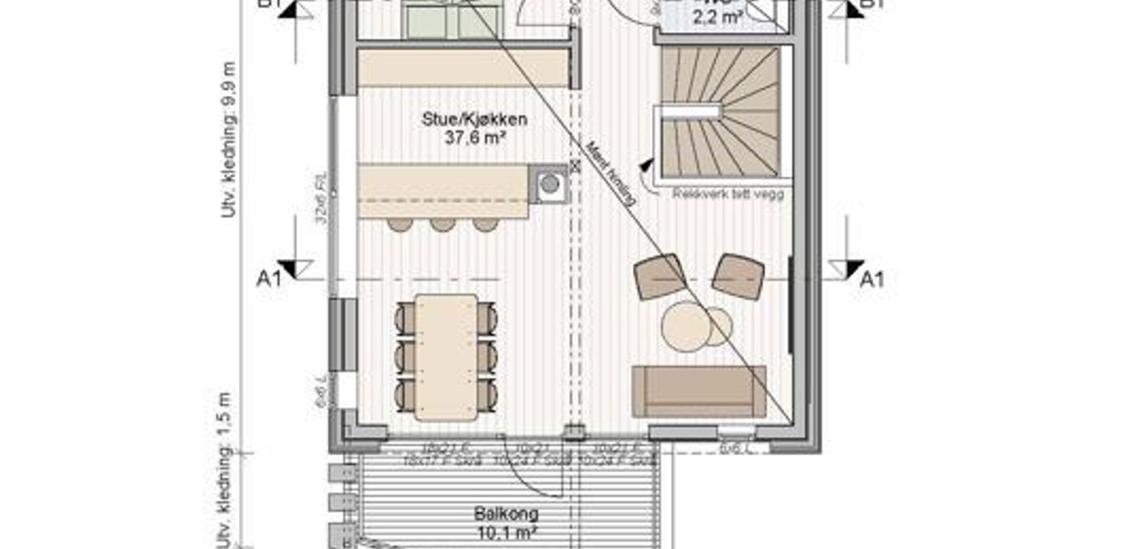 Stue/kjøkken er et godt rom med god takhøyde og perfekt for tomt med utsikt.