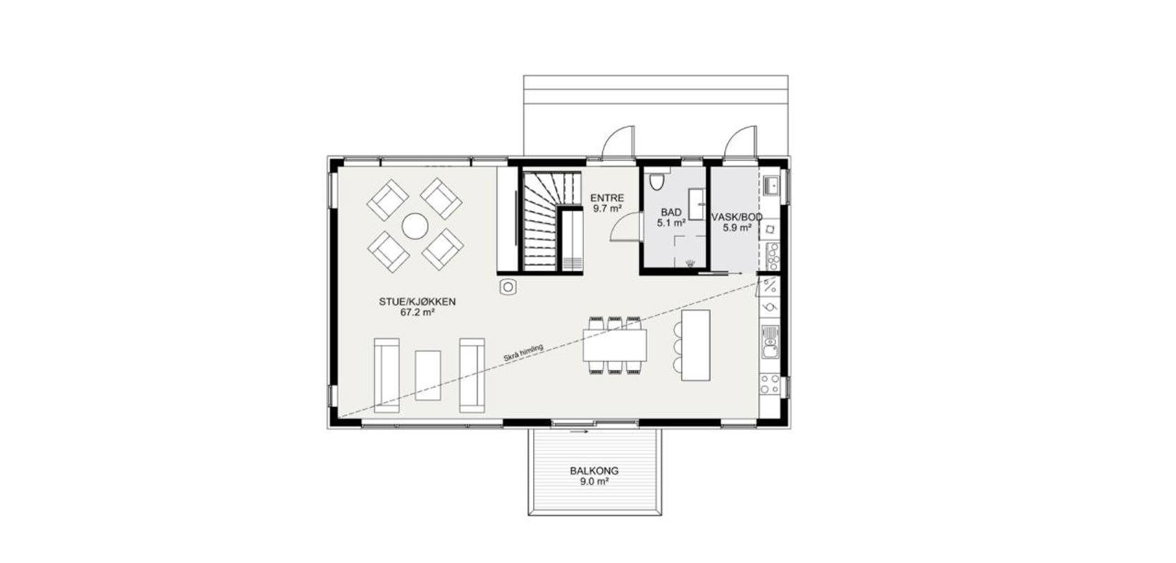 Den øvre etasjen har en imponerende takhøyde på over tre meter på det høyeste, og består av et stort åpent oppholdsrom med kjøkken og stue. Stuen har skyvedør ut til balkongen på forsiden, og gir en fantastisk utsikt over området rundt. Det er også et bad samt et kombinert vaskerom og bod i denne etasjen.