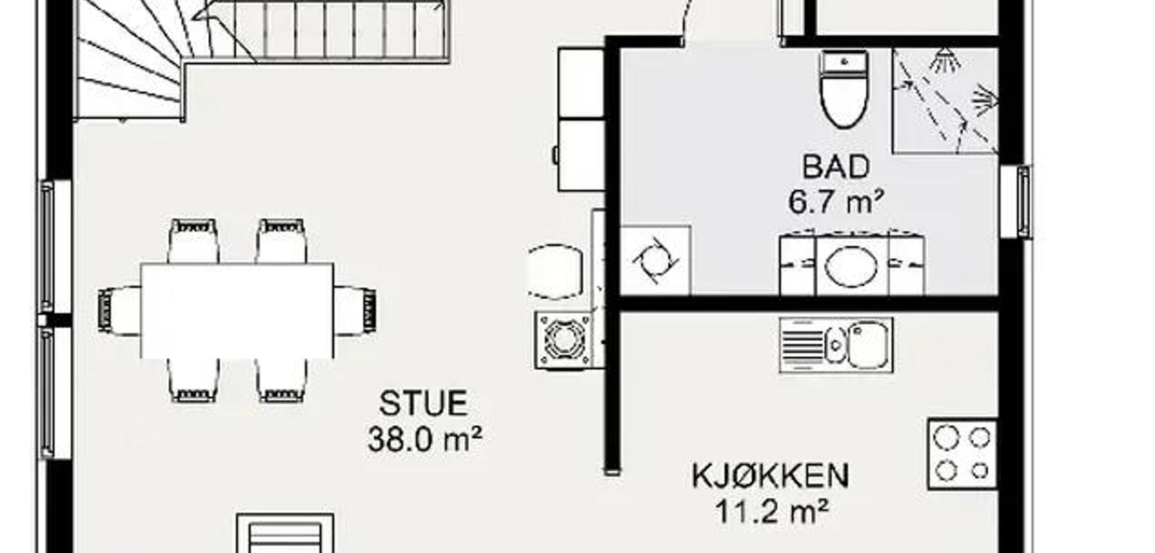 Inngangspartiet har et praktisk takoverbygg, og du vil finne en romslig bod på en side og et bad på den andre siden av gangen. Stuen har både en spiseplass og en hyggesone, og du har en kort vei til kjøkkenet.