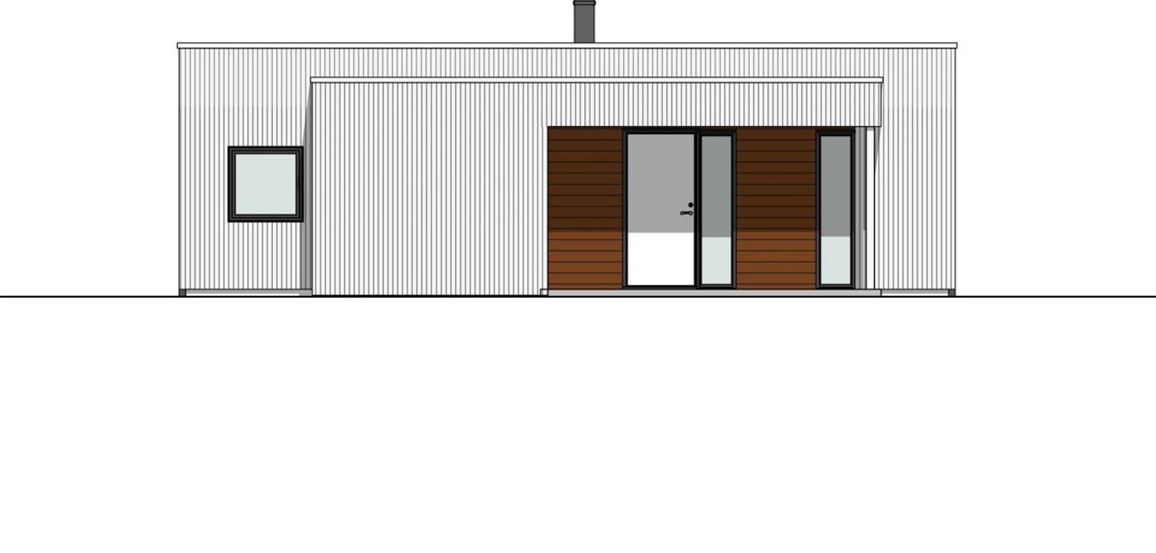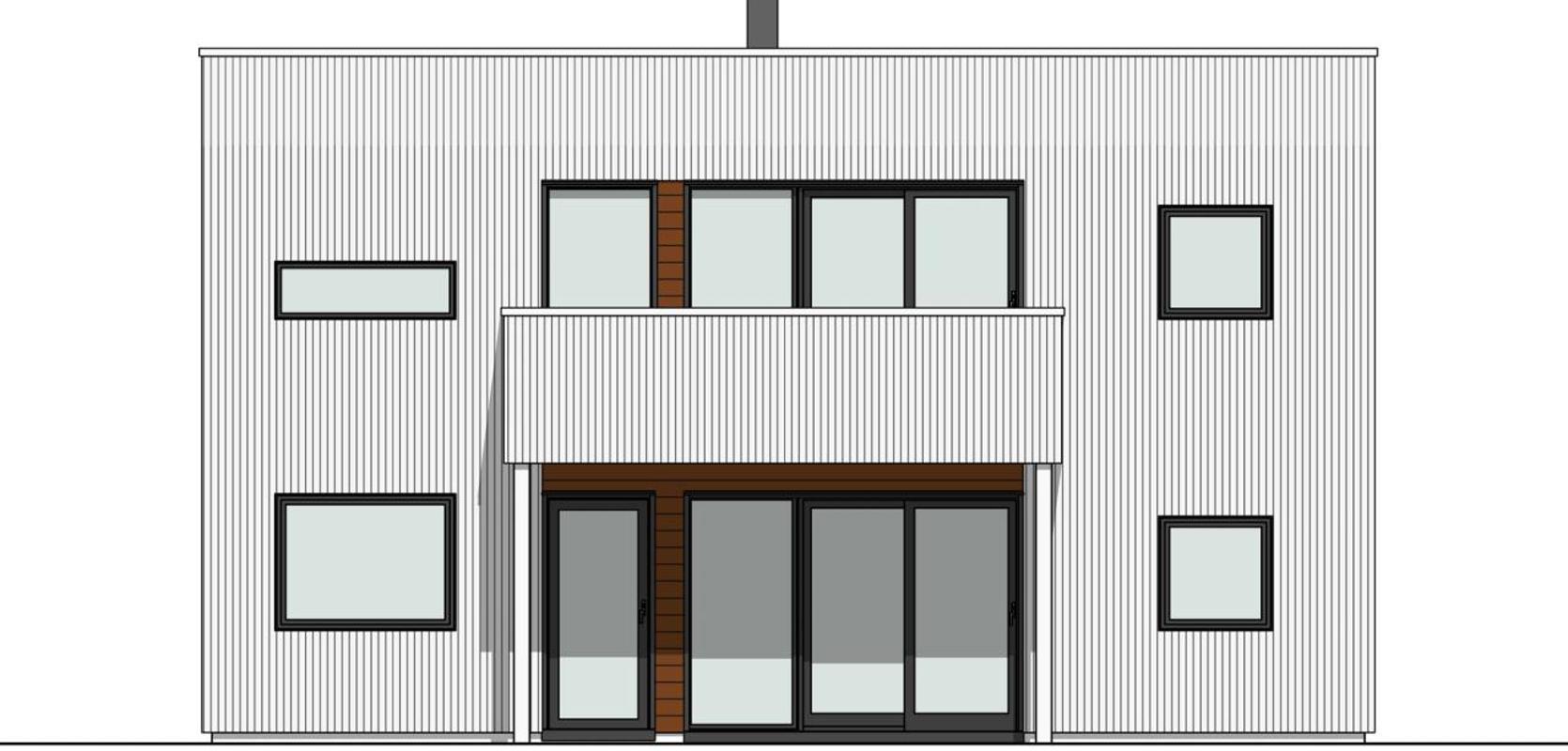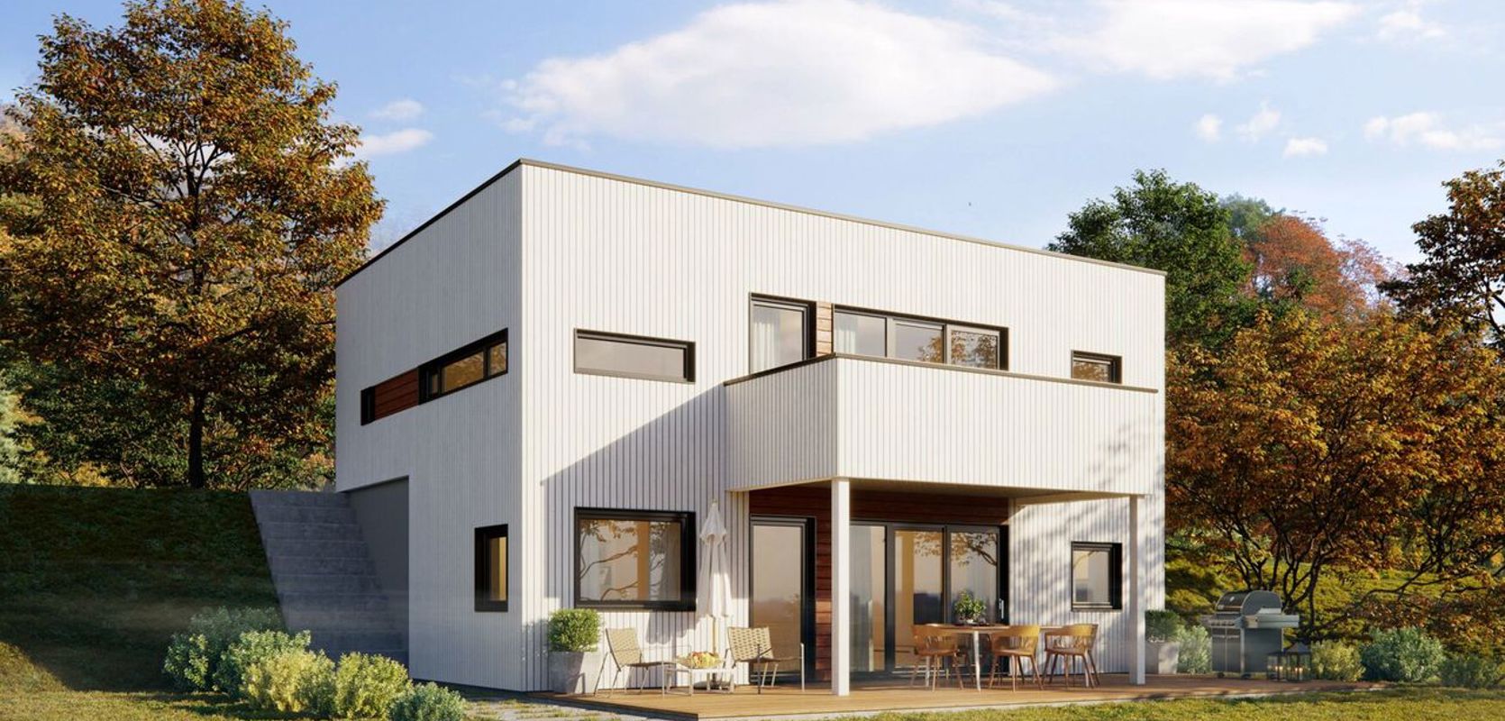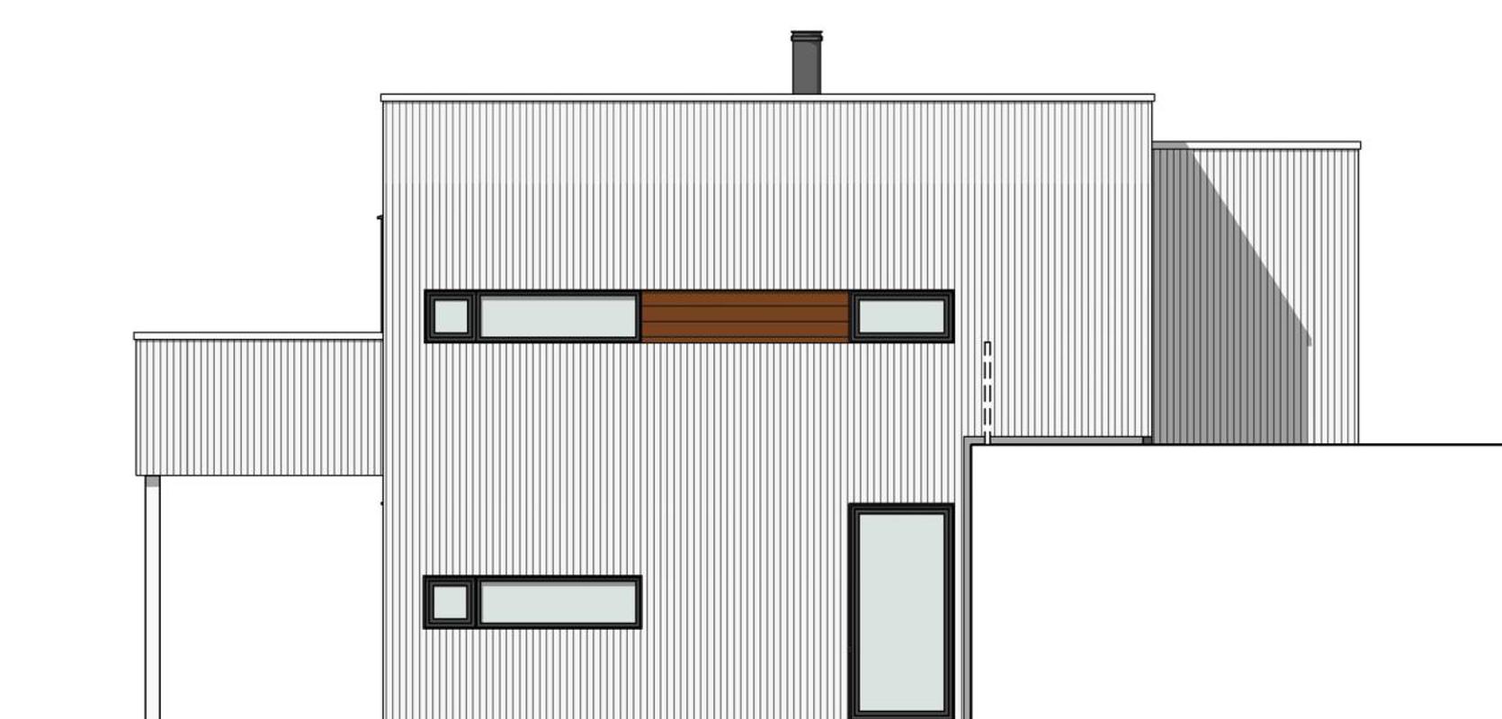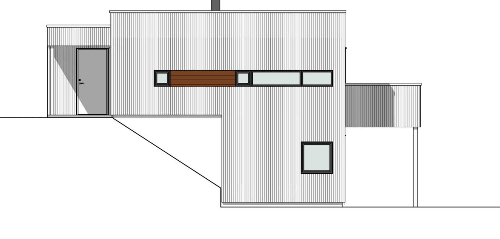 Midtstuen har en stilren fasade, med stående trepanel. Det flate taket gir huset et funkispreg. Dette er et spennende og moderne hus for en designbevisst familie.
