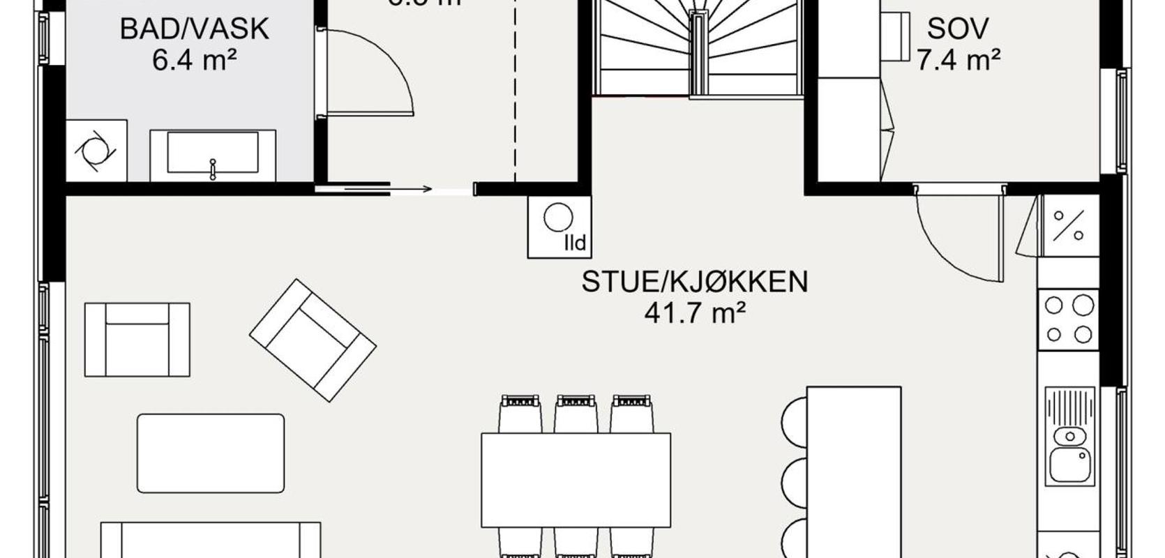 Boligen har inngang under et praktisk overbygg på øvre plan. Entreen leder inn til et stort og åpent oppholdsrom med kombinert stue og kjøkken, med flere soner.