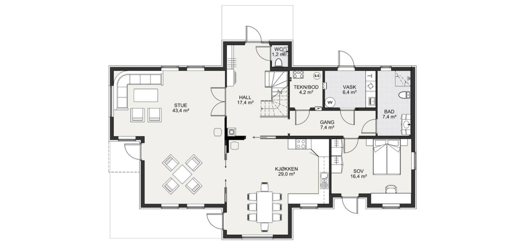 Her har du fire soverom, et gjesterom, stort kjøkken og en vinkelstue, to bad og eget vaskerom, samt en romslig loftstue. Du kan til og med velge å ha flere peiser i huset hvis du ønsker det.