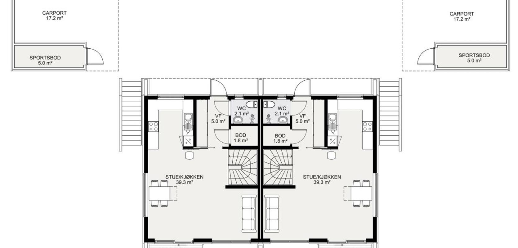 De store vinduene slipper rikelig med naturlig lys inn i boligen. Hver bolig strekker seg over to etasjer og gir rikelig plass å boltre seg på. I tillegg kan du utvide bruksarealet med en frittstående carport og sportsbod i samme stil som huset, som tilfører ytterligere 26 kvadratmeter og øker lagringskapasiteten.