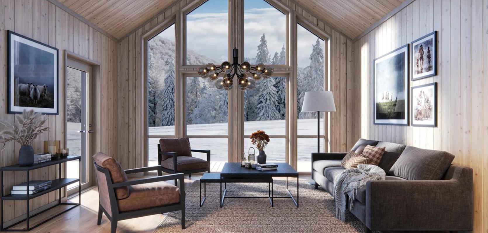 Hytta har en unik design med en mønehøyde på over fem meter og en vegg av vinduer, som gir mye naturlig lys og en flott utsikt.